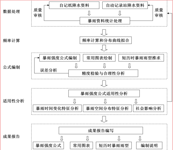 呼和浩特市暴雨強度公式編制的主要內容包括資料處理、單一重現期暴雨強度公式擬合、區間參數公式擬合、暴雨強度總公式擬合、常用查算圖表編制、精度檢驗、各強度暴雨時(shí)間變化特征和暴雨強度空間分布特征分析等內容,具體流程如下: